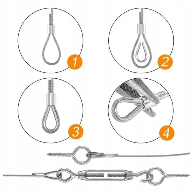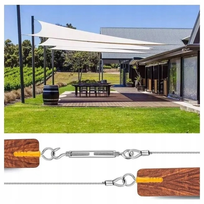 Zastosowane napinacze (śruby rzymskie) umożliwiają łatwe i kontrolowane napięcie linki, co ma znaczenie przy montażu siatek, osłon i konstrukcji wymagających stabilności.
