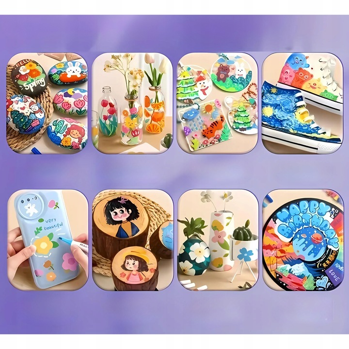 - Zastosowanie produktu: Kamienie, muszle, szkło, ubrania, czapki, pudełka papierowe, liście, buty i inne materiały mogą być używane do malowania i majsterkowania