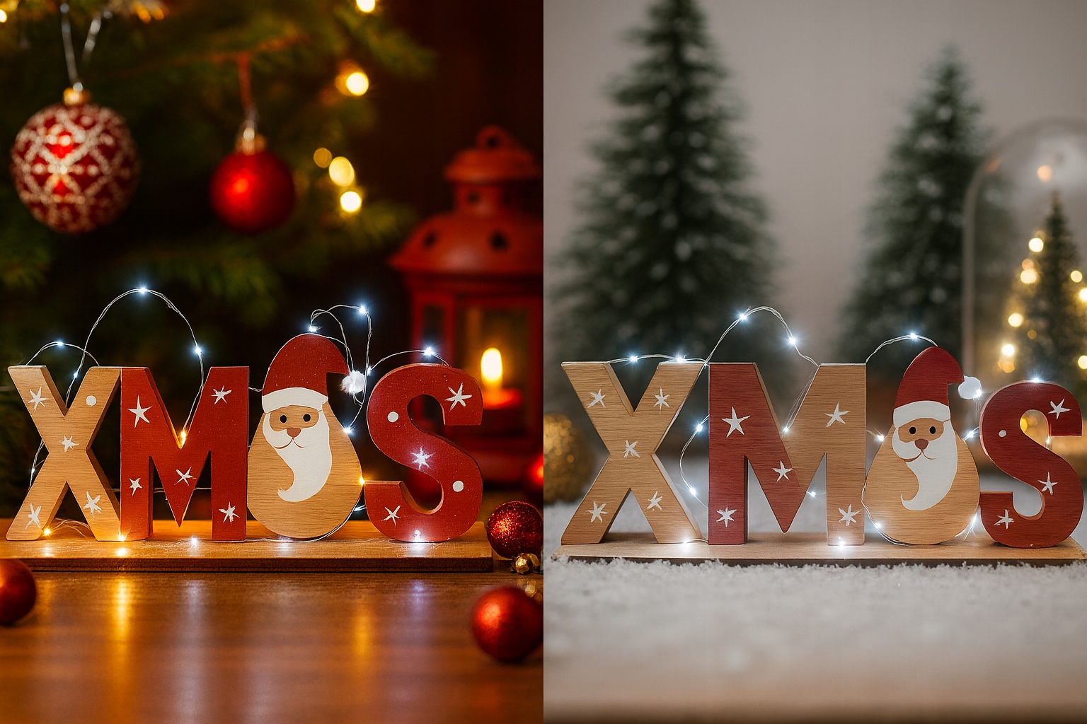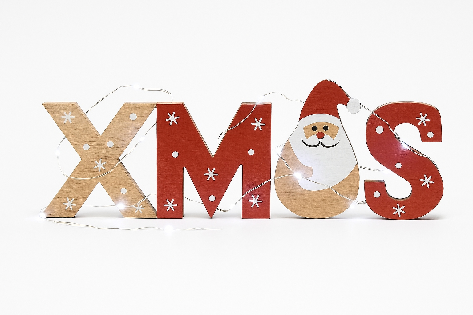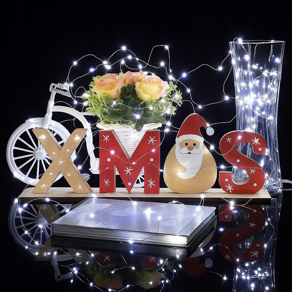 Drewniany napis świąteczny XMAS z girlandą LED – dekoracja stojąca