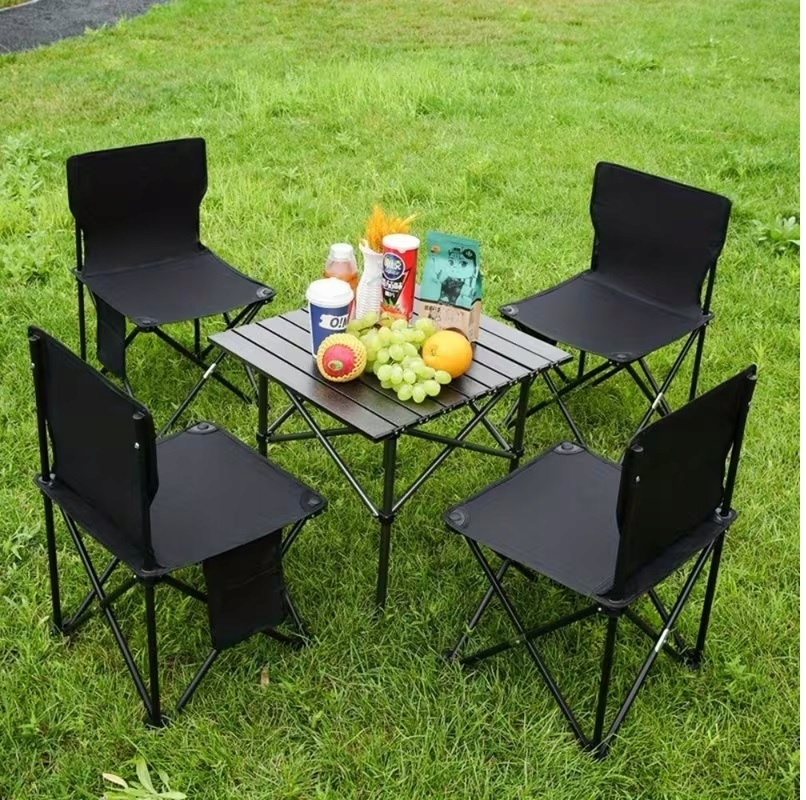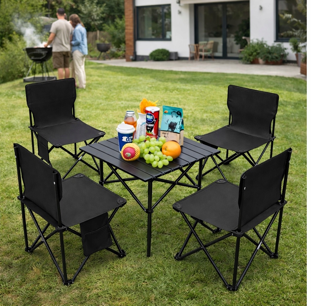 Zestaw turystyczny 5w1 stolik i 4 krzesła czarny wędkarski składany